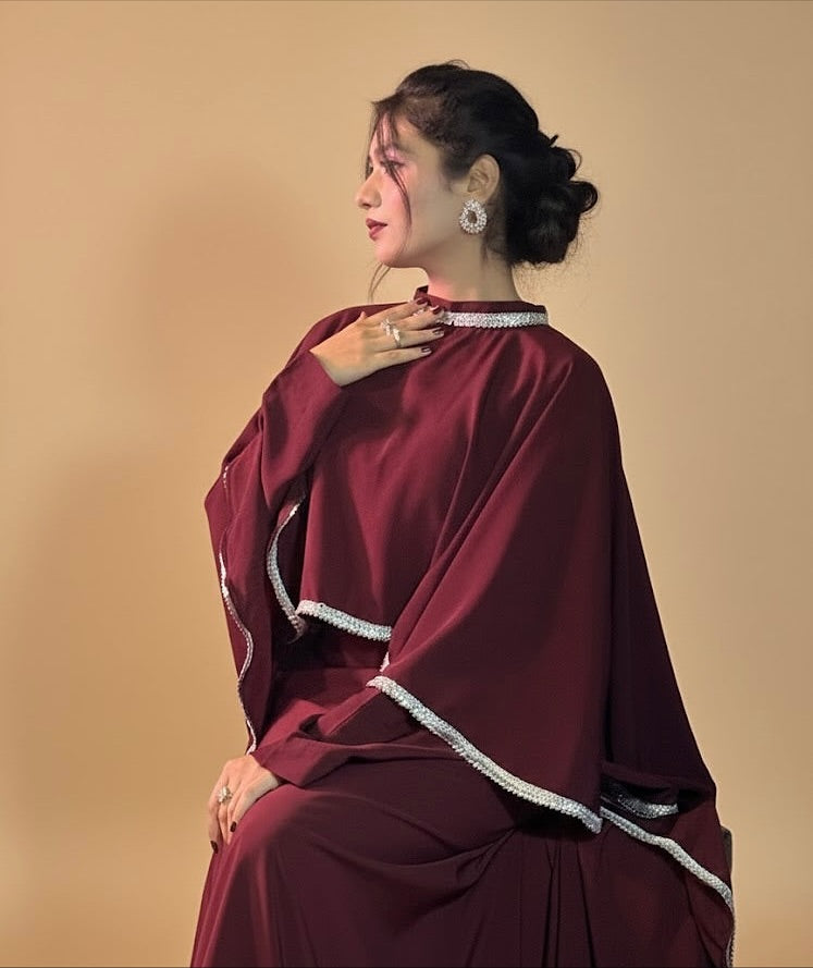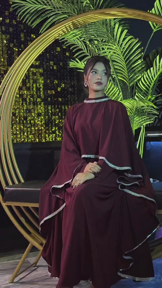 Grace meets sophistication in our Maroon Ameera Cape Dress — designed for women who love understated glamour. Crafted from premium Nidha fabric, this abaya flows effortlessly, offering both comfort and luxury. The deep maroon hue radiates elegance, while the shimmering crystal embellishment along the borders and neckline adds just the right amount of sparkle — perfect for wedding events, parties, or formal evenings.