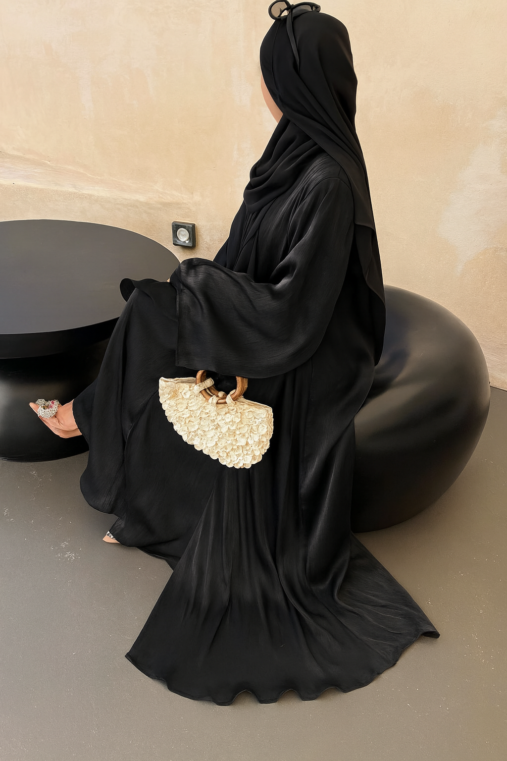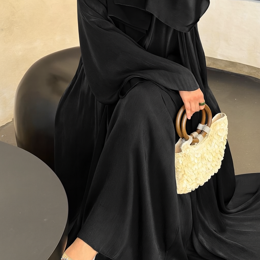 The Emerald Shimmer Veil Abaya is an exquisite full-length piece crafted from luminous zoom shimmer fabric, known for its soft texture and elegant, light-catching sheen. Draped in a rich emerald tone, this abaya features fluid lines, wide bell sleeves, and a sheer matching veil that gracefully covers the head and shoulders. The luxurious shimmer adds depth and movement to the garment, making it ideal for evening wear or special occasions. Styled with jeweled footwear, this look radiates sophistication while embracing timeless modesty.